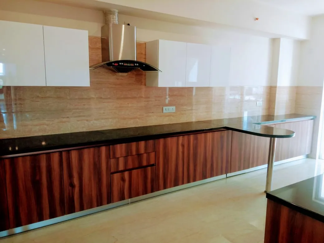 Stylish modular kitchen with sleek countertops, contemporary cabinetry.
