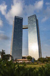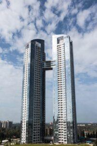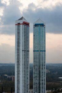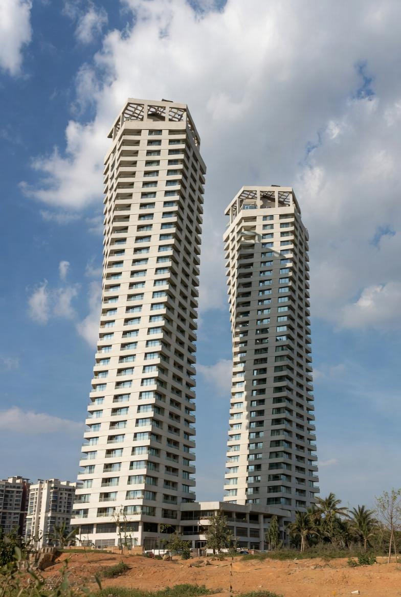 - Three high-speed passenger elevators + one service elevator per tower (Mitsubishi/Kone)