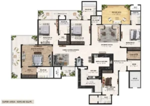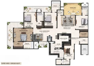- Sizes: Carpet area starts from ~2,471 sq.ft. up to larger premium units; super built-up area consistently around 4,390 sq.ft. (built-up ~3,517 sq.ft. in standard units)